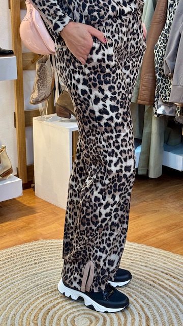 • Pantalon soft animal print, corte semioxford con cartera, tajon con cinta en la botamanga.