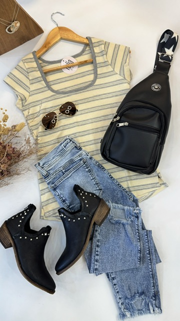 • Remera de morley rayado de algodon, escote cuadrado y manguita corta con tajos.