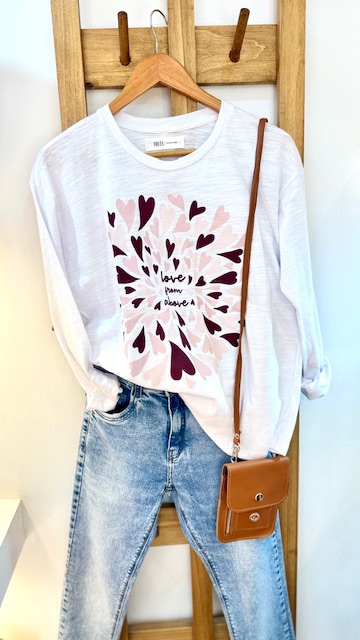 • Remera flame de algodon, manga larga, estampa corazones, con tajos. Talle unico