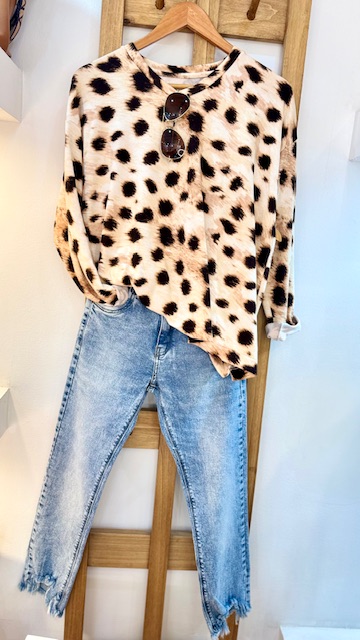 • Seater de lanilla de iscosa animal print, escote semi V, con dobladillo ancho y tajos. Talle unico amplio.