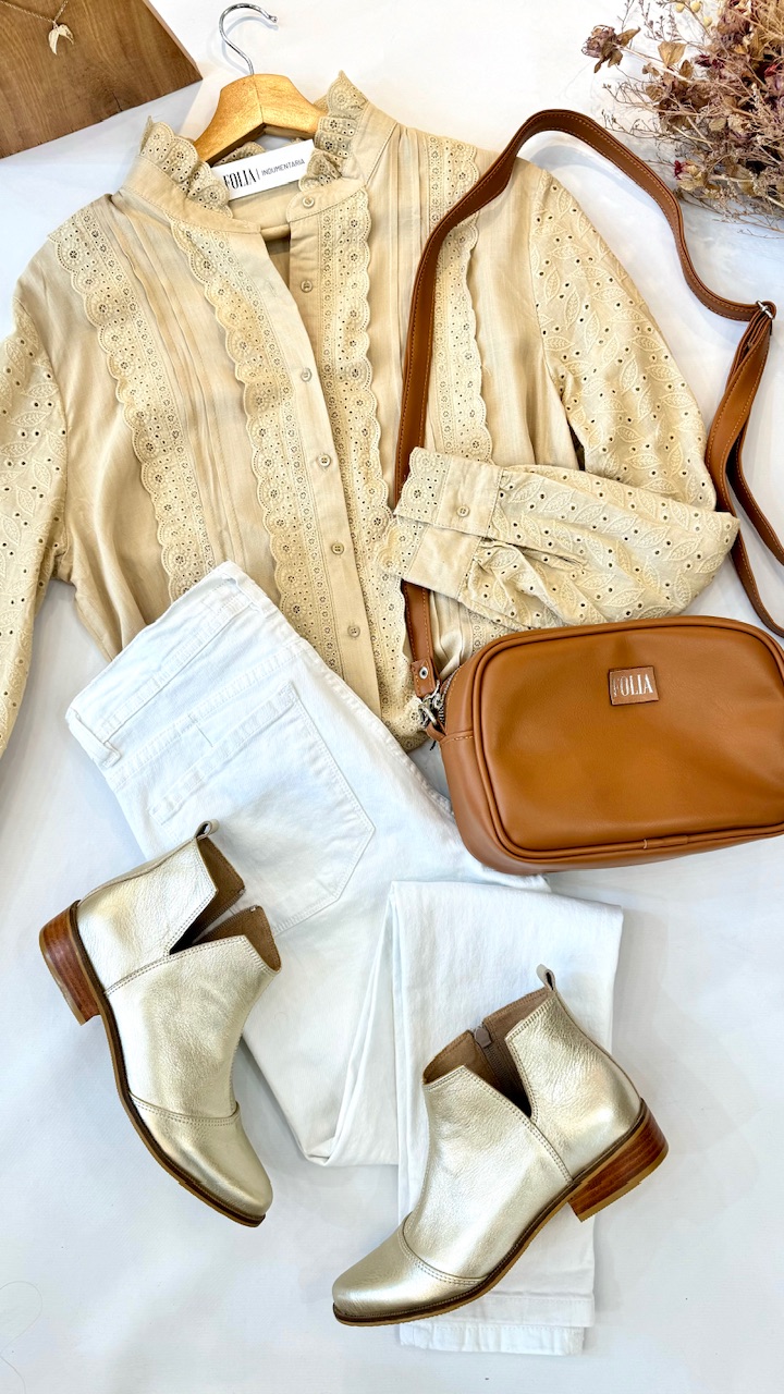 • Camisa con botones y detalles de broderie. Medidas: Largo 60cm. x Ancho 52cm.