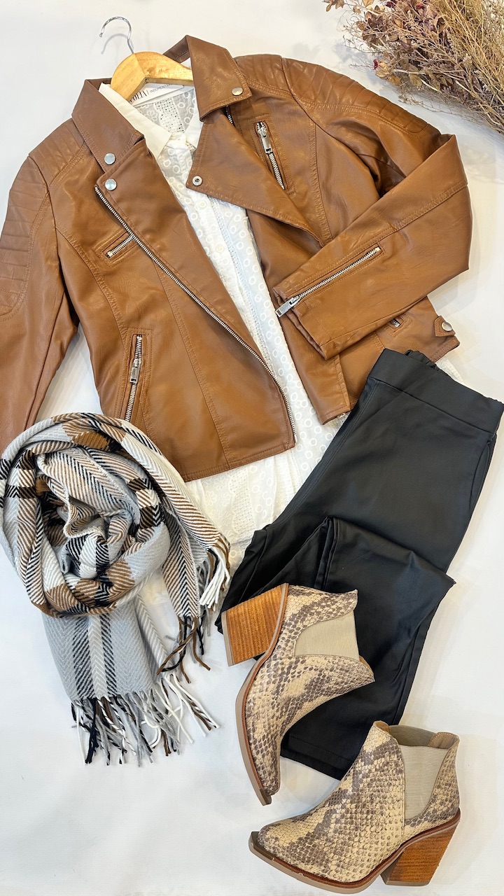 • Campera simil cuero con detalles de cierre y alforjas. Medidas: Largo 51cm. x Ancho 43cm.