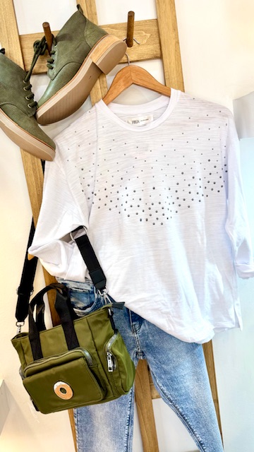 • Bucito de rib soft tipo lanilla, con recortes en hombros y laterales. Con tachas bombe. Talle unico amplio
