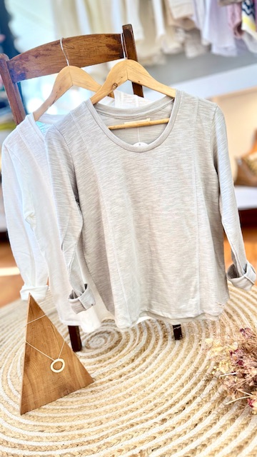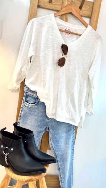 • Remera de lanilla flame de alodon, mangas largas, escote en V. Detalle en los hombros. Talle unico
