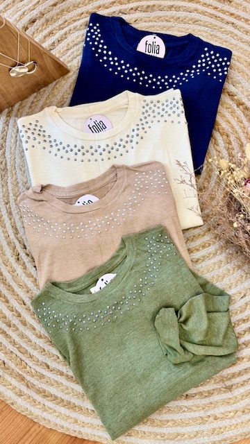 • Sweater de lanilla soft escote redondo , con apliques de tachas bombe en cuello y hombros. Con tajos. Talle unico