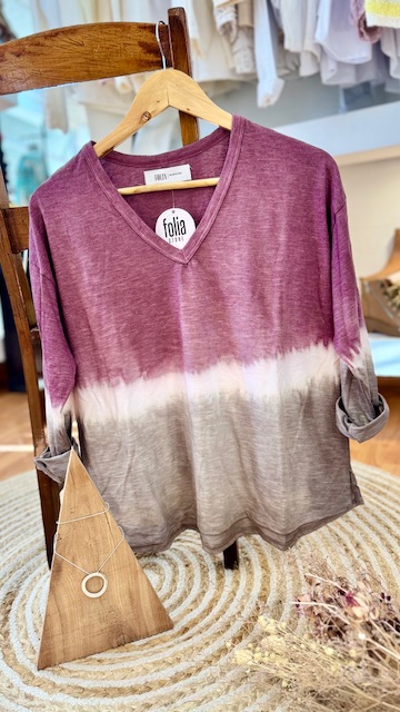 • Remera de algodon tenido batik artesanal a dos colores. Escote V y manga larga. Talle unico amplio.