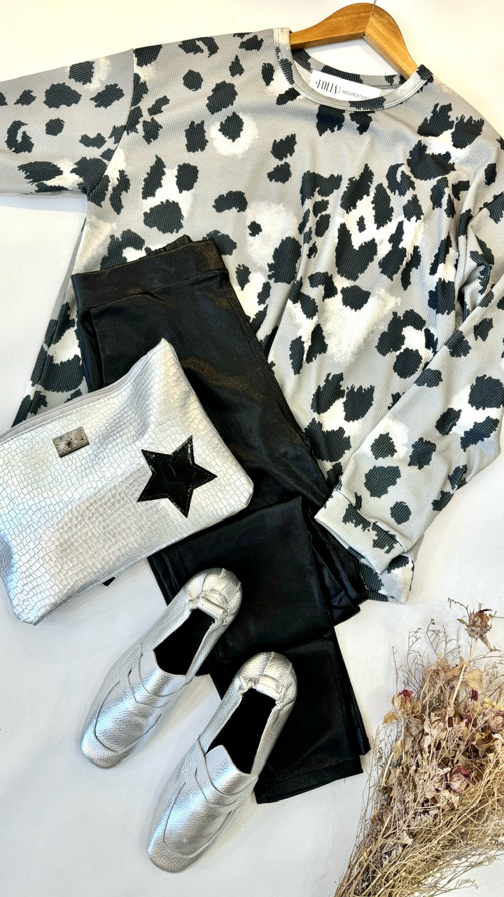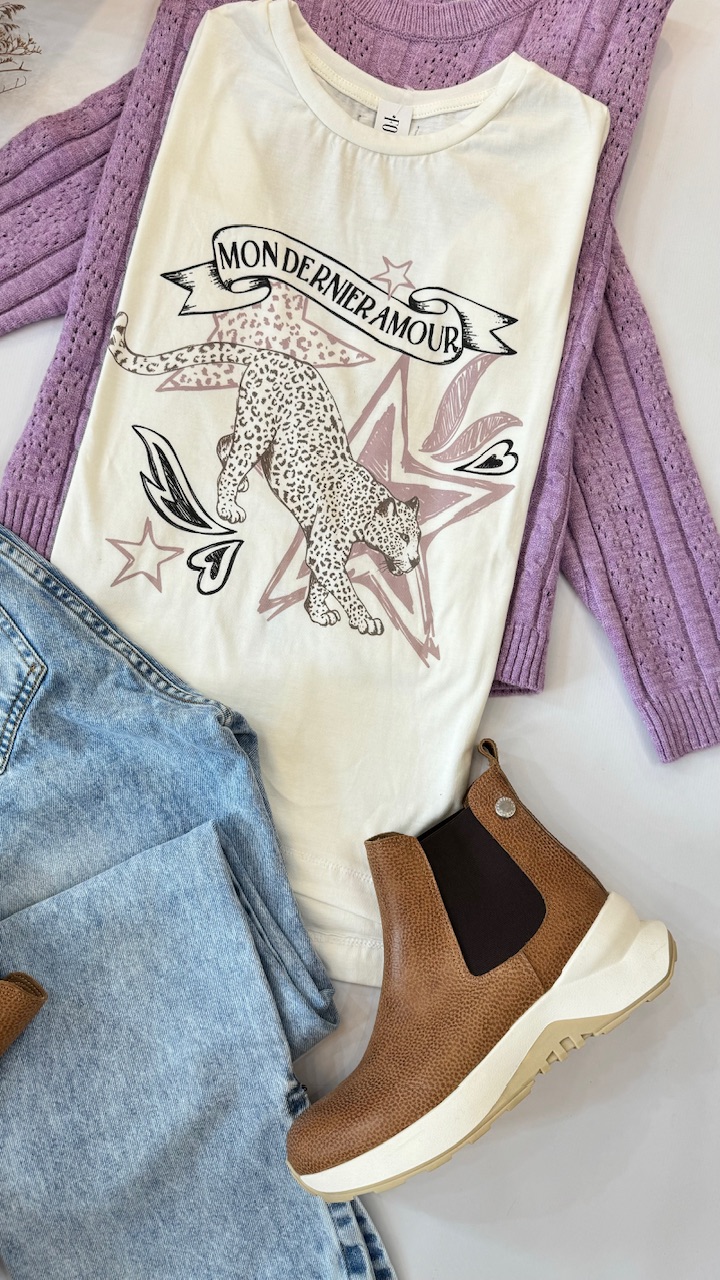 • Remera manga larga estampa leopardo mon dernier Amour, dobladillo ancho, de algodon. Medidas Largo 58cm. x Ancho 51cm.