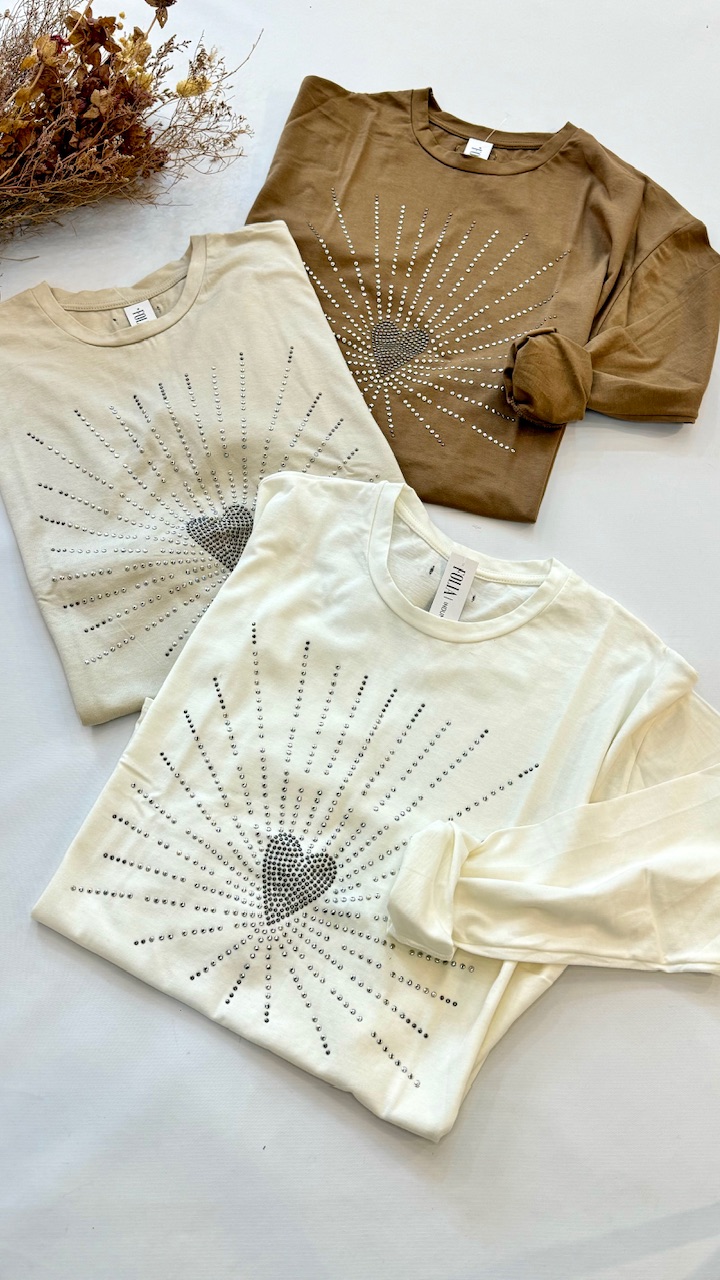 • Remera manga larga aplique corazon con rayos en tachas, de algodon con tajos. Medidas: Largo 64cm. x Ancho 59cm.
