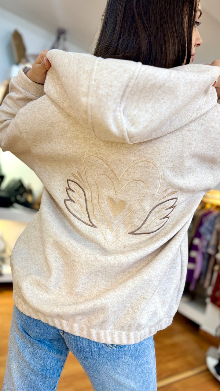 • Campera de paño rogel de punto, con capucha, con cierre y bordado corazon en delantero y espalda. Medidas: Largo 64 cm. x Ancho 59cm.